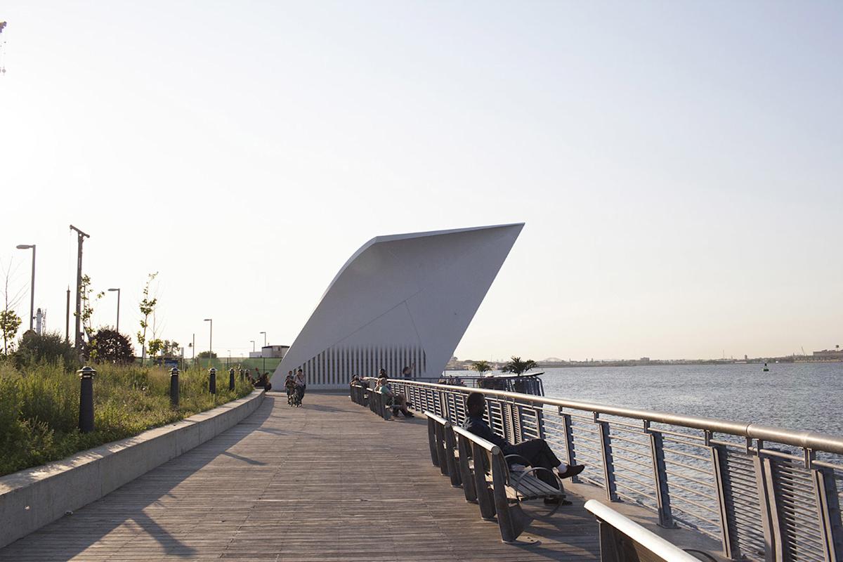 Located along Staten Island’s North Shore Waterfront Esplanade, the Staten Island September 11 Memorial resembles a pair of wings reaching skyward. Architect Masayuki Sono created the slim, smooth structures to appear like oversize postcards, honoring the Staten Island victims of the 2001 terrorist attacks. The inside walls of the $2.77 million construction feature 274 plaques with the names, birthdays, job titles and profile silhouettes of loved ones lost. Borough President James Molinaro and Mayor Michael Bloomberg dedicated the memorial on September 11, 2004.