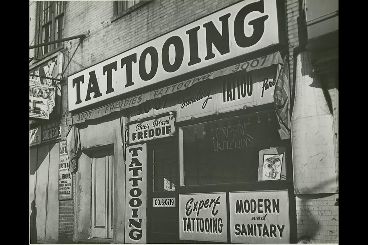 "Tattoo Shop of Coney Island Freddie just prior to New York City’s ban on tattooing"(1961), by Irving Herzberg. Courtesy, Brooklyn Public Library