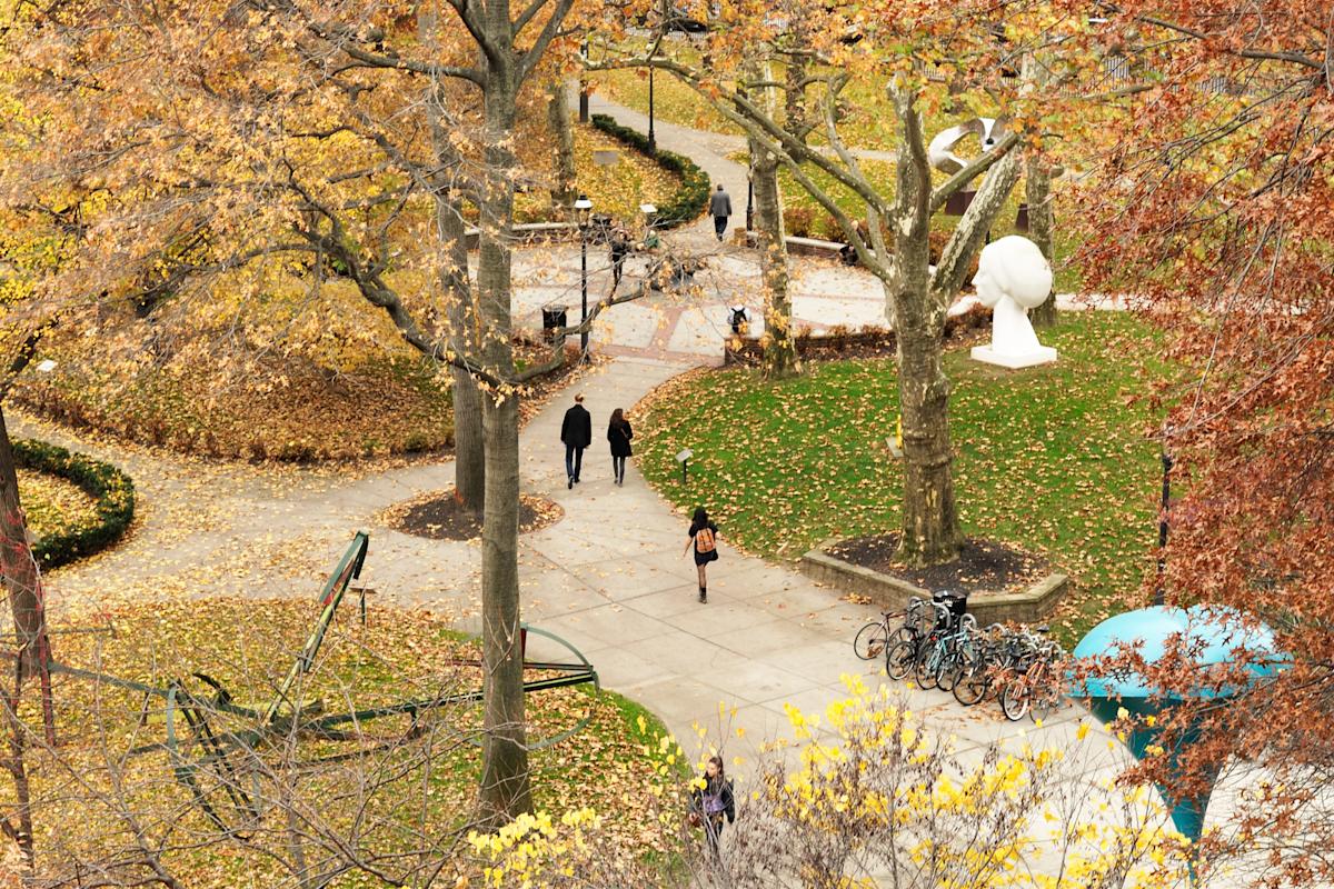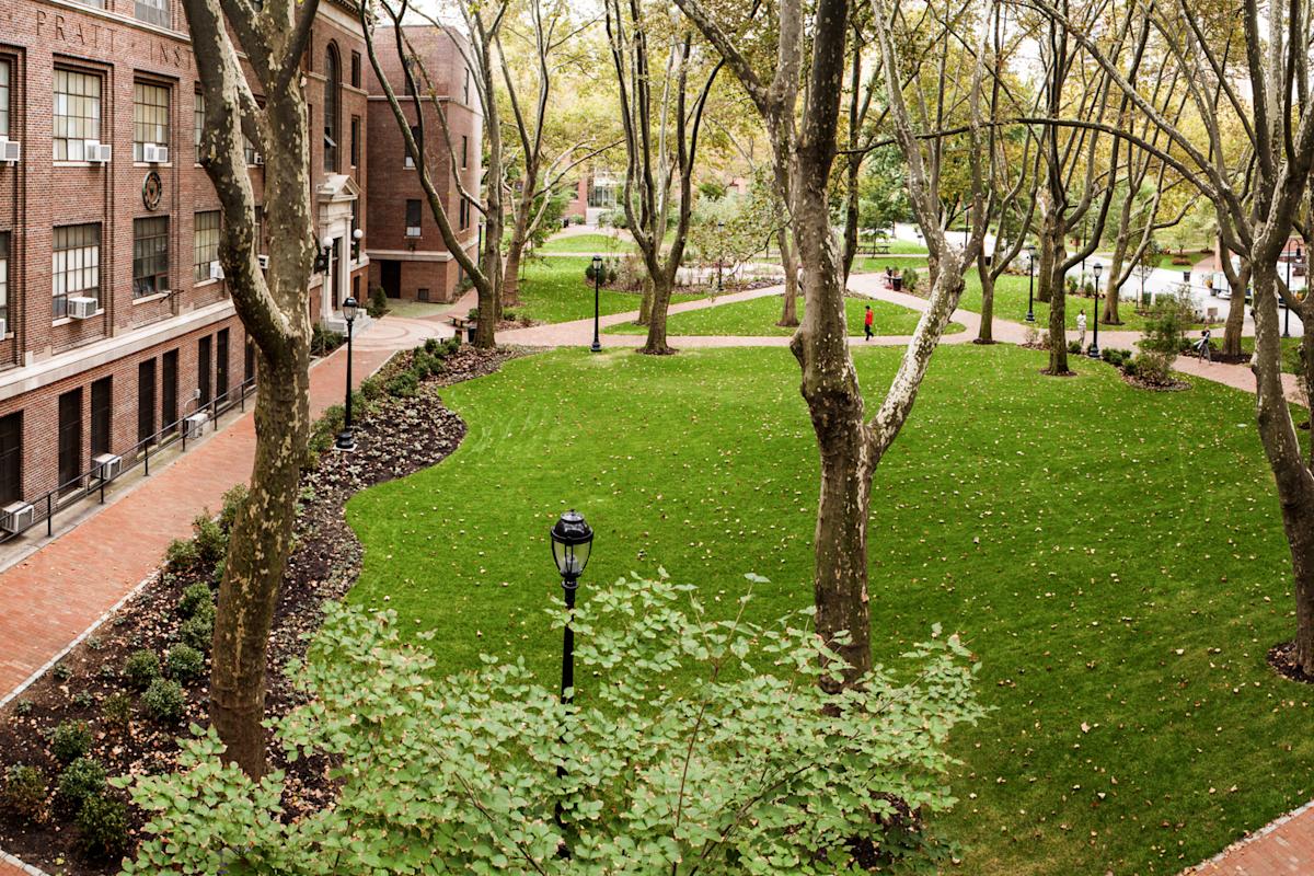 Der Brooklyn Campus des Pratt Institute ist eine Oase der Grünanlagen in der urbanen Landschaft von Clinton Hill, voller Bäume, Rasenflächen, Amphitheater und Pfade, die in einem Stil angelegt sind, der an ein idyllisches New England College erinnert. Der Campus ist auch mit modernen Skulpturenstücken verstreut – was ihn zum größten Freiluft-Skulpturenpark in New York City macht – und voller Klassenzimmergebäude, die in einer Vielzahl von architektonischen Stilen gebaut wurden, von neoklassisch bis viktorianisch.