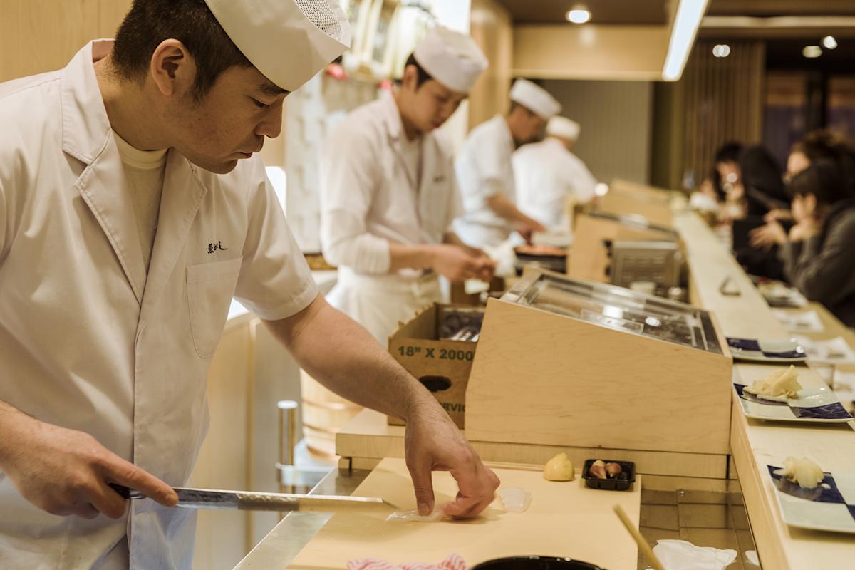 Sushi zaubert ruhig und selbstbewusst rohen Fisch wie Butter im Uogashi, einem gehobenen japanischen Restaurant mit hellem Holz. Anspruchsvolle Gäste pflücken mit den Fingern Meeresfrüchte-Sahne und verwenden dabei nur Stäbchen für geschmackserfrischende Ingwerspäne. Egal, ob Sie mit den Händen essen oder nicht, Sie erhalten zu Beginn der Mahlzeit warme Handtücher. Wenn Sie an der langen Theke sitzen, haben Sie die Möglichkeit, die Köche bei der Arbeit zu beobachten. Wählen Sie aus Gründen der Privatsphäre einen Tisch hinter einem Schuss weißem Stoff.
