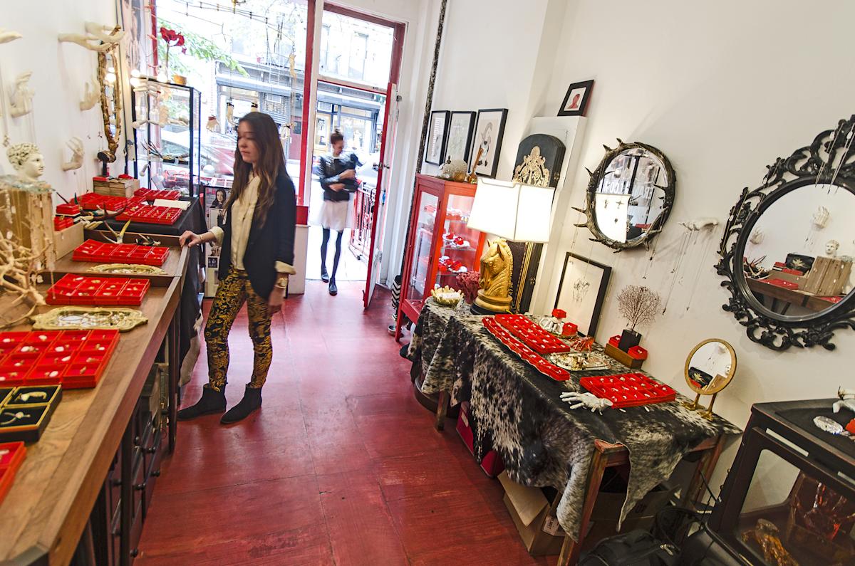 Dieses skurrile Schmuckunternehmen – wie z. B. goldfarbene Messingringe mit Dinosaurierköpfen, Ohrstecker in Form von zierlichen Kobras oder Halsketten mit einem zweiköpfigen Häschen – ruft dieses East Village Storefront-Haus an. Fans können die eigenartigen Ring-, Halsketten- oder Ohrring-Designs der Linie in individueller Größe aufgreifen.