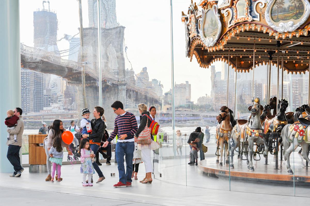 Brooklyn Bridge Park, como su nombre indica, se encuentra debajo del puente de Brooklyn. Atrae a miles de visitantes cada semana que vienen a disfrutar de vistas impresionantes de Manhattan y lugares idílicos para picnics a lo largo de la costa. El parque también alberga eventos especiales, como películas gratuitas con vistas, kayak y clases de fitness. La atractiva atracción costera comprende una serie de muelles llenos de instalaciones recreativas, jardines, patios de juegos, greenways y áreas de césped para pasar el rato. Pier 2 cuenta con canchas de baloncesto y pickleball, así como una pista de patinaje en línea. Una "playa" arenosa sirve como lancha de bote (no motorizada) en el muelle 4. Encontrará áreas de juego aptas para niños en ambos extremos (y algunas entre ellas); las del muelle 6 incluyen columpios, toboganes, un sandbox gigante y una fuente. También hay mucho para que las familias aprendan y exploren en el Centro de Educación Medioambiental de Conservancy. Los botes del ferry de NYC se detienen en los muelles 1 y 6, mientras que el ferry a Governors Island también embarca y desembarca del muelle 6.