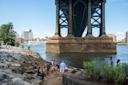 People sitting in the grass in Brooklyn Bridge Park, Brooklyn, NYC