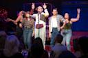 A group of five performers on stage sing passionately. The central figure gestures energetically with both hands raised. They are dressed casually, with plaid shirts and jeans. The audience is visible in the foreground, watching the performance.