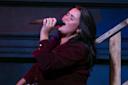 A person passionately sings into a microphone. They have long dark hair and are wearing a dark jacket. The background is dimly lit with a wooden handrail visible.