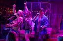 A band performs energetically on stage under purple lighting. Three musicians, two men and a woman, sing into microphones with raised arms, while playing guitars and tambourines.