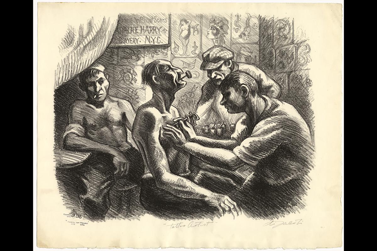 "Tattoo Shop of Coney Island Freddie just prior to New York City’s ban on tattooing"(1961), by Irving Herzberg. Courtesy, Brooklyn Public Library