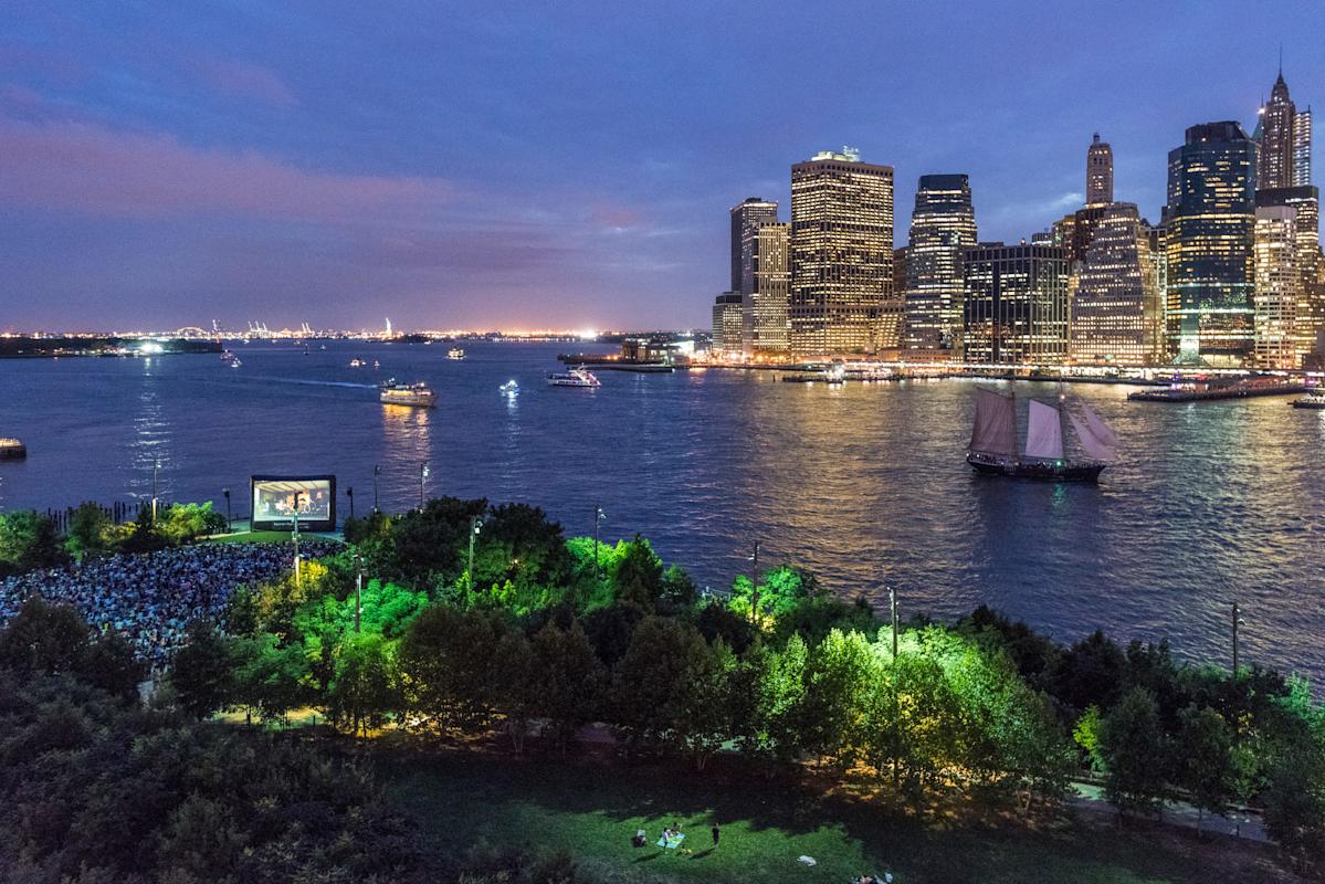 Une colline légèrement inclinée offre le cadre idéal pour regarder des films en plein air à Brooklyn Bridge Park, l’espace vert le plus spectaculaire du quartier. Les vues sur les célèbres gratte-ciel de Lower Manhattan attirent souvent l’attention des spectateurs avec une gamme de films récents (Selma ) et classiques (It Happened One Night ).
