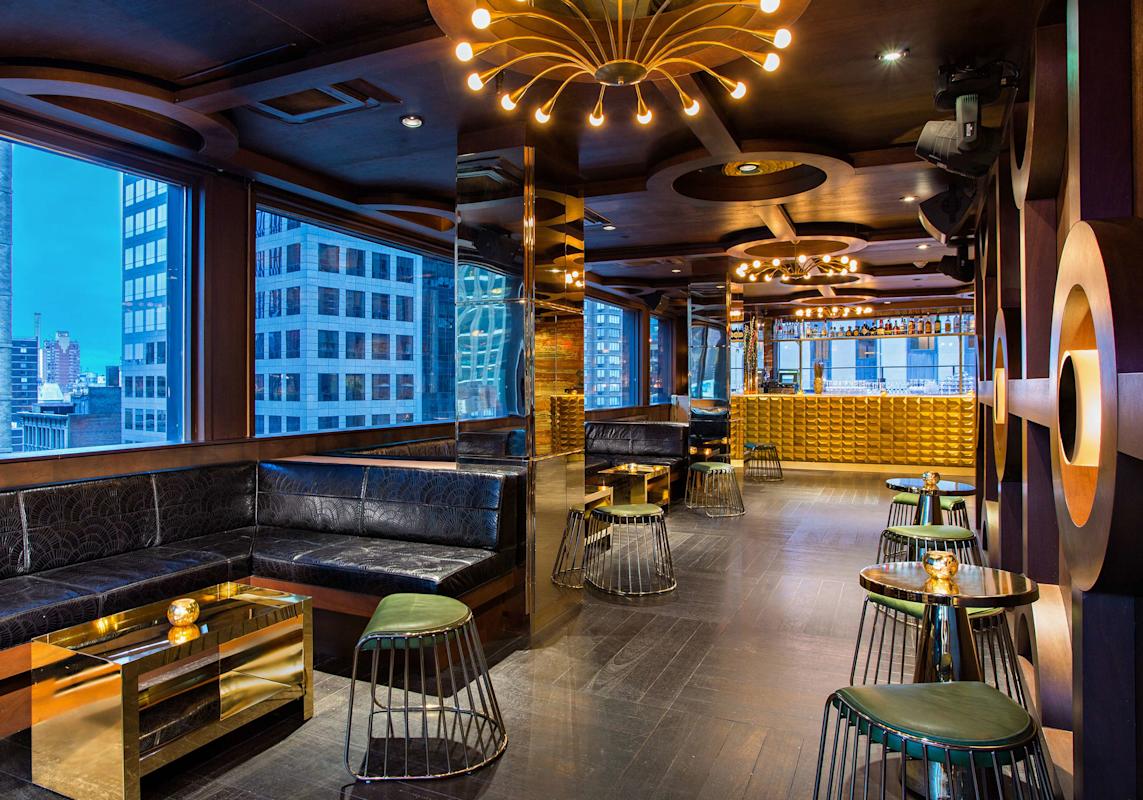 Rise above Times Square and enjoy breathtaking Midtown views amongst the skyscrapers at PHD Terrace on top of the Dream Hotel. Guests can go between the bi-level space: a quieter indoor floor found on the lower level (15th floor) featuring a gold ceramic tile bar and leather banquets to enjoy a crafted cocktail or the outdoor rooftop space on the upper level (16th floor). But it doesn’t feel like a typical lounge. The design is inspired by a luxurious penthouse, making it a prime destination for chic nightlife in the area.