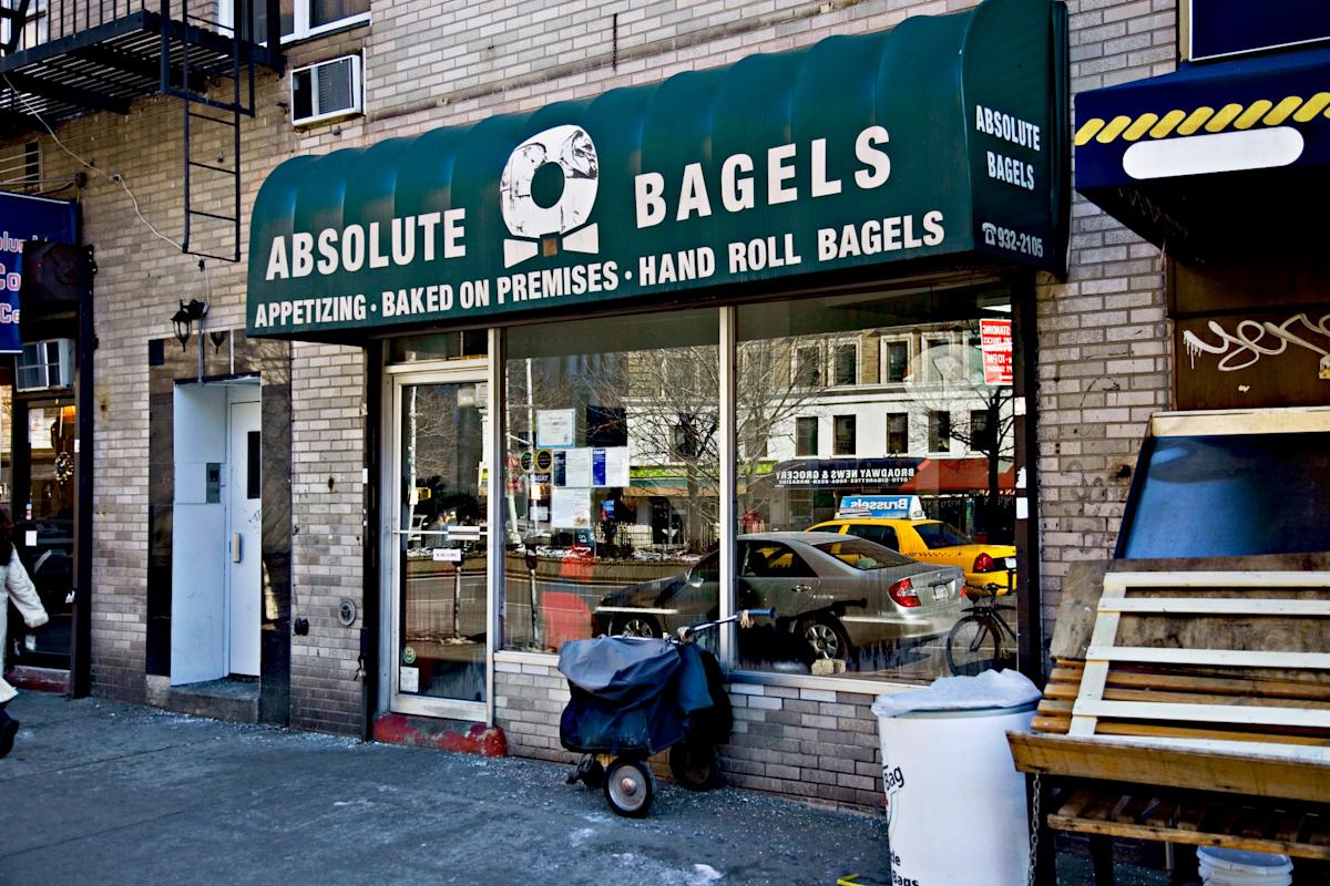 Alguns dizem que os Bagels Absolutos são os melhores. Na verdade, frescos do forno, são difíceis de vencer: a versão do ovo, tão dourada quanto uma gema, é obrigatória, e os bagels brilhantes e perfeitamente texturizados são grandes, mas não grandes. Para aqueles com apetites menores, a versão de lanche de 60 centavos é um atrativo popular, atraindo os alunos de Columbia para filas que dão as portas nos fins de semana. O espaço da vitrine é um pouco abafado, com apenas algumas mesas e uma pequena música pop tocando no estéreo. As crianças adoram os sabores doces e frutados, como morango, mirtilo e maçã, enquanto os adultos se inclinam mais em direção a schmears padrão e salmão nova. Há também azeite e pimento Tofutti para os intolerantes à lactose.
