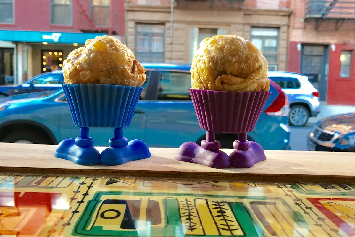 Empanadas get a modern twist at Che Cafe, an East Village nook that formerly lodged Abraço (which moved to larger digs across the street). Tennis-ball-size pouches, called chechenitas, are deep-fried to a golden crunchiness. Steamy savory fillings include chicken with sun-dried tomatoes and smoky chipotle, spinach with feta and rib-eye steak with onions, leeks and cheese. If you crave sweet street food, try the plantain and coconut pocket with raspberry puree and whipped cream.