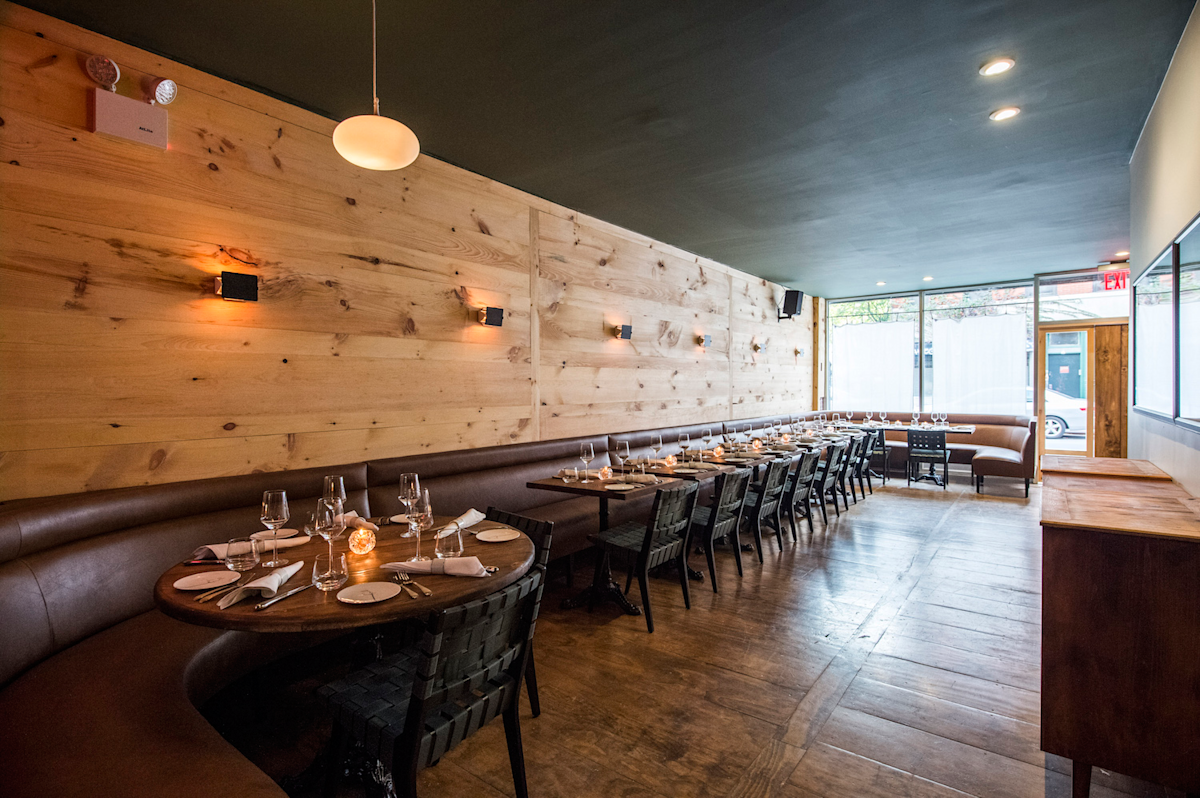Hugh Crickmore, formerly a partner at Mas (Farmhouse), and Alex Leonard—an ambitious chef who rose through the ranks at Blanca, in Bushwick—teamed up to found Lowlife at the end of 2015. Named for Luc Sante's cultish chronicle of New York City's underbelly and a 1985 album from English rock band New Order, Lowlife is more plush than punk. Knotty pine walls and stacked birch limbs furnish a woodsy feel. The seasonal, avant-garde menu includes items like fluke with hackleback caviar, chicken yakitori with smoked cabbage and lamb tartare with mint and shrimp salt. The voluminous wine list concentrates on natural wines from small producers.
