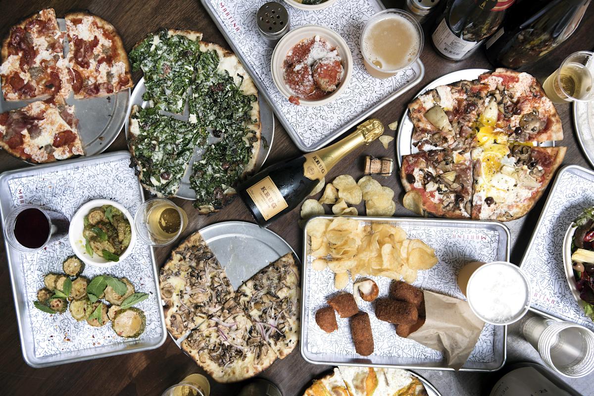 Step up to the counter and watch cracker-thin pizzas stretched and fired up at this fast-casual offshoot of Danny Meyer’s popular Marta. Add chicken meatballs and golden-fried risotto balls to your order, plus a cup of fior de latte soft-serve topped with chocolate-amaro sauce, candied hazelnuts, olive oil or sea salt. Beverages include Mexican Coke and half-bottles of French Champagne.