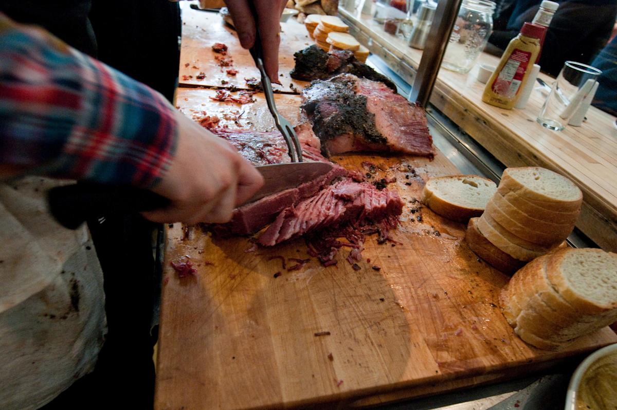 A young law school student originally from Montreal, Noah Bernamoff decided to go on leave from Brooklyn Law School and open a Jewish deli instead, inspired by the famous Schwartz's back home. He and his crew hand-slice smoked meat behind the counter, building overflowing sandwiches at a fair price. Available all day (or until there are no more) are glossy, slightly sweet bagels flown in from Montreal, topped with cream cheese, salami scrambled with onions and peppers or house-cured salmon or sable. The whitewashed space is a fraction of the size of Katz's Delicatessen and is generally packed from the time it opens. So many Manhattanites made the pilgrimage to Bernamoff's Brooklyn deli that he and his partners decided to come to them, opening Mile End Sandwich in NoHo. Mile End tends to run out of meat early on, so it's best to check for updates on its Twitter page before you go.