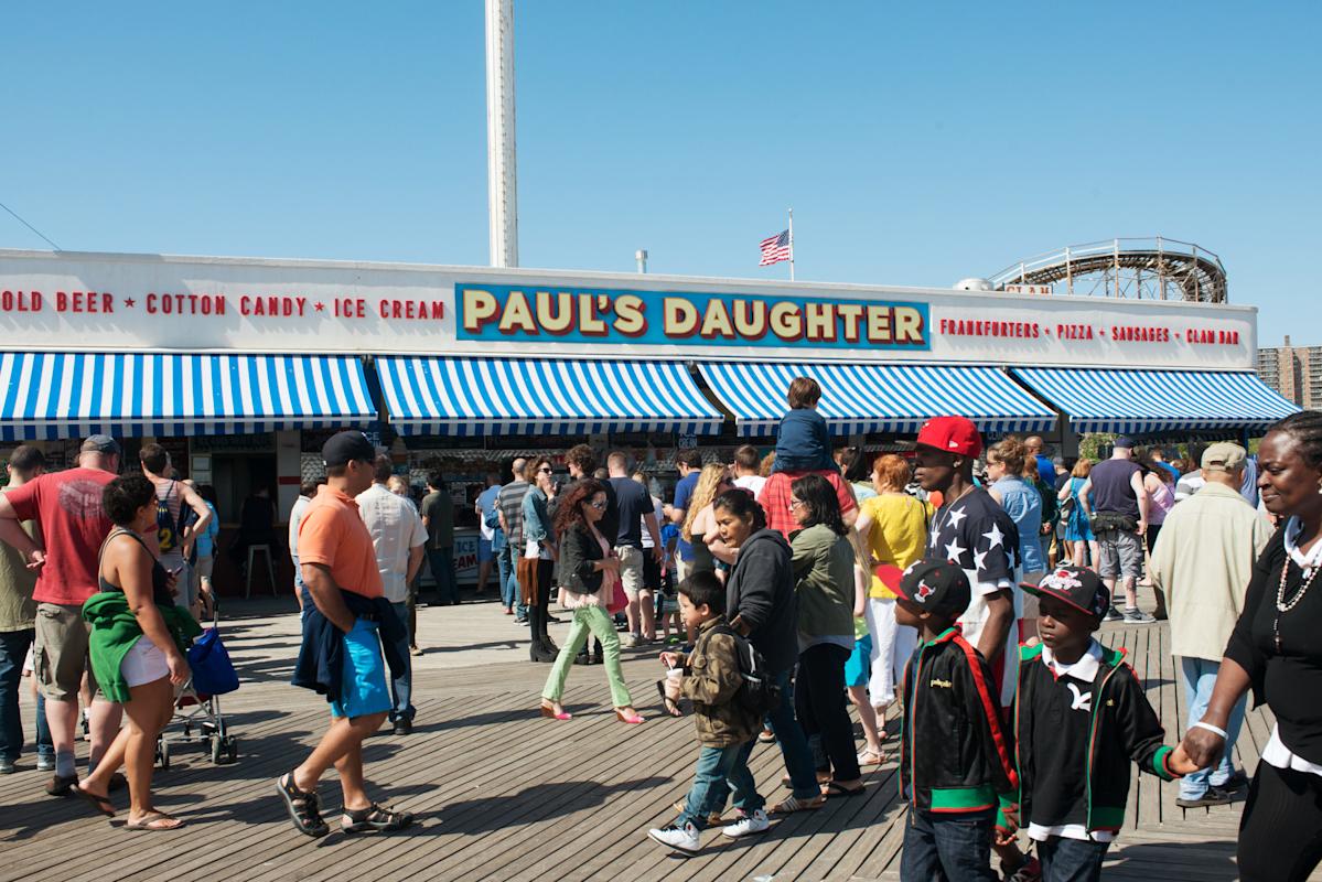 One of the classic Coney Island boardwalk joints, Paul’s Daughter has been serving corndogs, hot dogs, Italian ices, knishes, soft serve, funnel cakes, sausages, cotton candy, clams on the half shell, fries and beer to hungry beach-goers for more than six decades. The stand is impossible to miss—their iconic rooftop statues of a family brandishing hamburgers are visible from all the way across the beach.