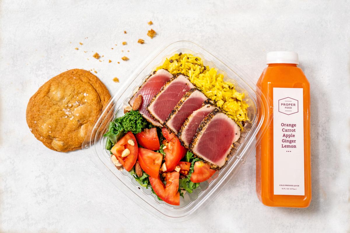 Proper Food is a clean café offering prepared salads, sandwiches, coffee and tea to go. Grab and go healthy hot and cold dishes line the shelves. Choices include ahi tuna salad as well as a vegan tempeh sandwich.