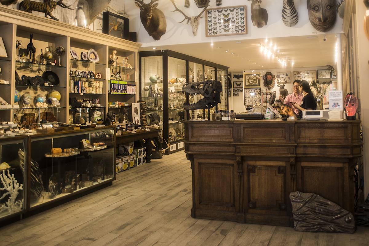 A skeleton stands guard outside of this cavelike spot, suggesting that a jaunt here is not for the faint of heart. It’s true: The taxidermied animal heads and skeletal jaws lining the walls provide a frightening sight. Also check out the slightly creepy collectibles including replica skulls of wolves, hyenas and lions ($90–$395); bracelets crafted out of genuine beetles ($39); and man-eating piranha figurines ($35). But beyond freaky stuff, the natural selection can also include gorgeous curios, like displays of blue morpho butterflies ($39), and eye-popping rock formations, including malachite from Zaire, silver pyrite from Peru, 500-million-year-old ocean jasper from Madagascar and yellow sulfur crystal from Bolivia.